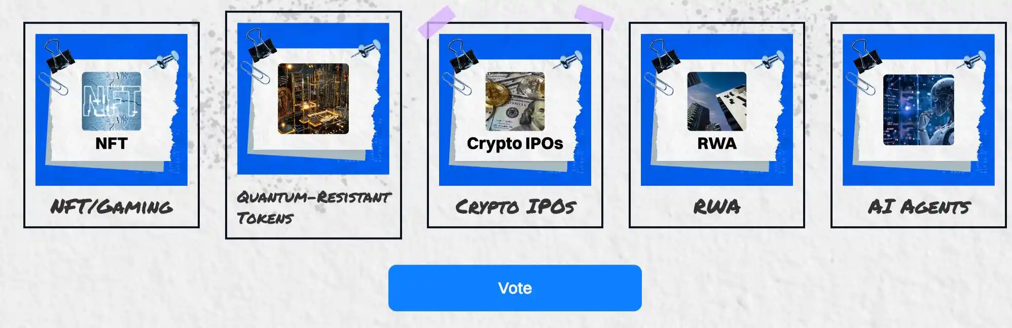 在该部分,CoinMarketCap 来了次开放票选,把 25 年展望的决定权交给了用户,等于一个市场调查,看看大家看好哪些赛道和项目。