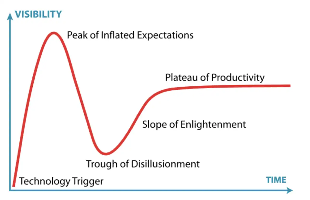 Lily:我觉得任何一个新的技术它都有一个「Gartner Hype Cycle」(技术成熟度曲线)。每个技术会有首先被发现的时候有一个非常大的增长,然后进入低谷期,接着是上升期,最后进入稳定发展期。区块链领域也是这样发展的,以前是 NFT,现在是 Meme 和 AI,它们长远都会存在,但都会经历这样的过程。