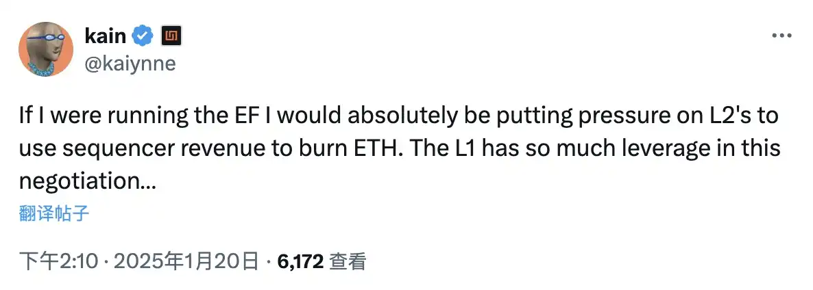 周一下午,Kain 于 X 发文表示:「如果让我来运营 EF,我绝对会向 Layer 2 施加压力,要求他们使用排序器收入来销毁 ETH。以太坊在这场谈判中拥有很大的优势……。」