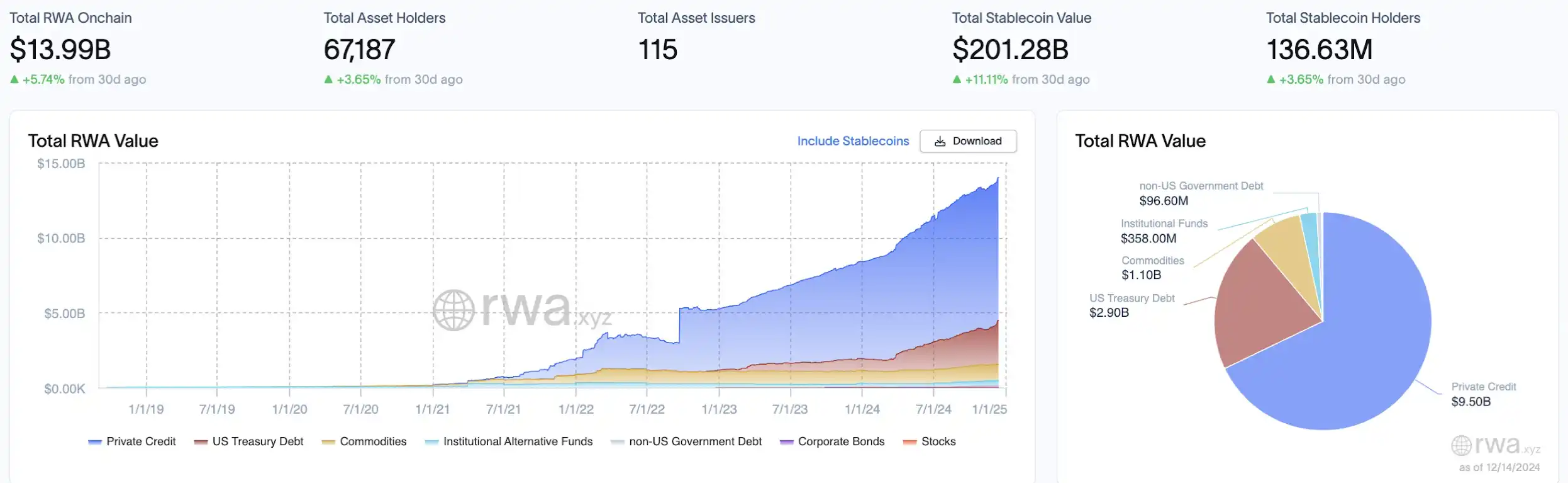 根据 RWA.xyz 的数据,截至十二月 14 日,RWA 已拥有 67,187 位持有者,资产发行方数量达到 115 家,总市值高达 1,399 亿美元。包括 Binance 在内的 Web3 巨头预计,到 2030 年 RWA 市场规模有望扩张至 16 万亿美元。这一潜力巨大的市场格局、以及其稳定收益带来的投资吸引力,正逐渐成为 DeFi 生态系统中不可或缺的重要组成部分。
