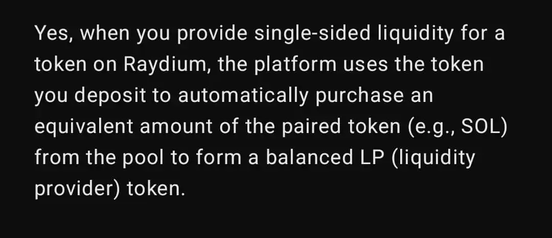 当你在 Raydium 上为某个代币提供单边流动性时,平台会使用你存入的代币自动从池子里购买等量的配对代币,如 SOL,形成一个平衡的 LP 代币。