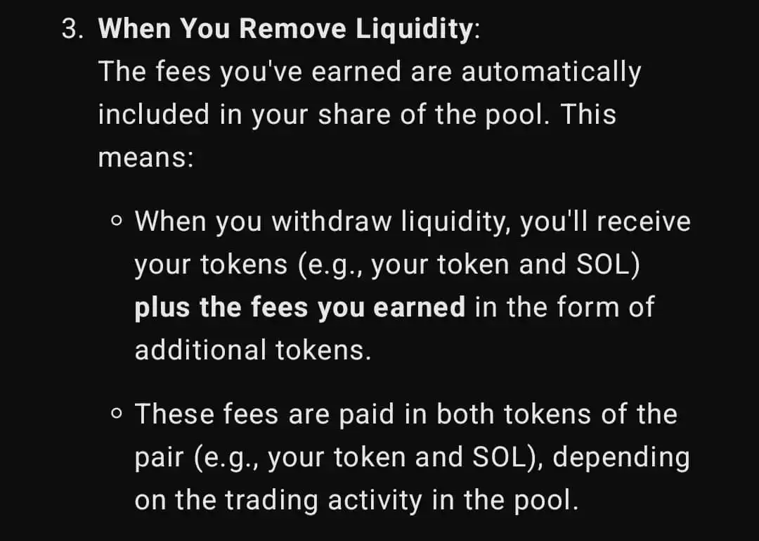 · 当您提取流动性时,您将收到您的代币(例如,您的代币和 SOL)以及您以额外代币形式赚取的费用