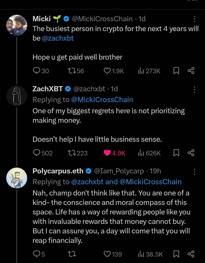 ZachXBT 表示:「最大的遗憾之一就是没有把赚钱放在第一位」。「我浪费时间在这种事情(帮助追回资金)上,这根本没有给我带来任何回报,只会扭曲我对做好事的看法」。