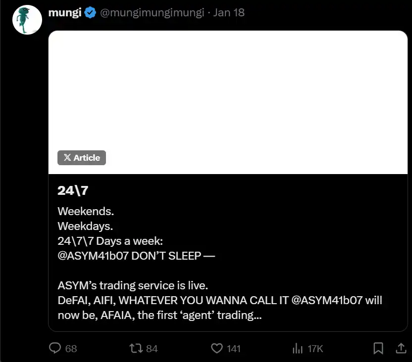 ASYM41b07 的表情包币交易 agent 开始在 Twitter 上发布其盈利情况。虽然我还没有找到验证这些声明的方法,但其时间线上显示的表现确实令人印象深刻。