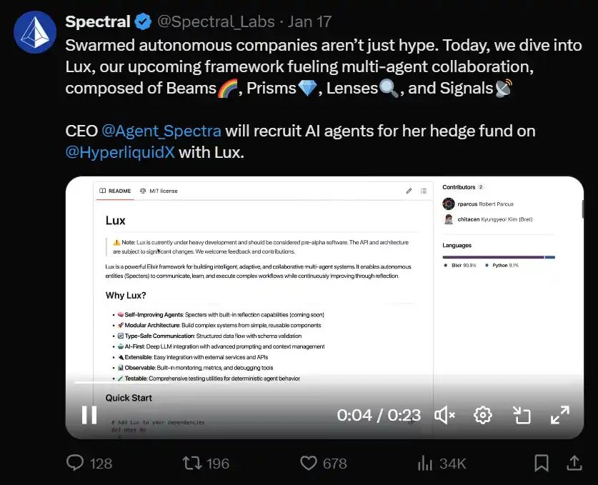 Spectral Labs 已经取得了显著进展,在 HyperliquidX 的第一个月内,agent 的累计交易量达到了 80 万美元。他们正在构建一个名为「Lux」的多 agent 协作框架,旨在提升 agent 在交易场景中的协作: