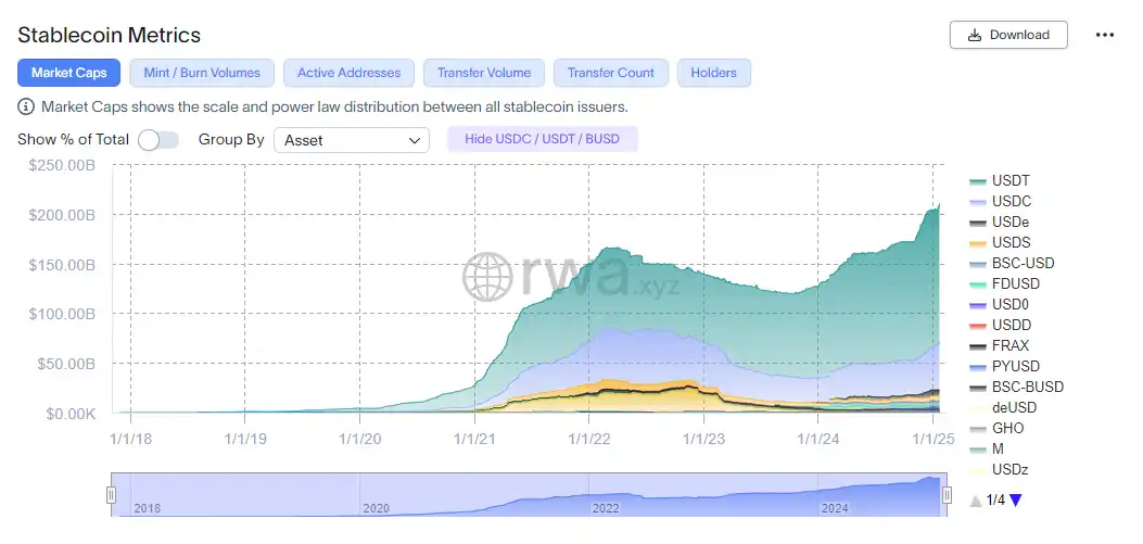 RWA 涵盖了广泛的资产类别,包括稳定币、私人信贷、美国国债、大宗商品和股票等。在这些资产中,稳定币因其独特性和重要性,可以被视为一个独立的赛道。对于非稳定币类的 RWA,由于资产标准化的复杂性及政策法规的不完善,规模相对较小,我们将重点关注稳定币领域。
