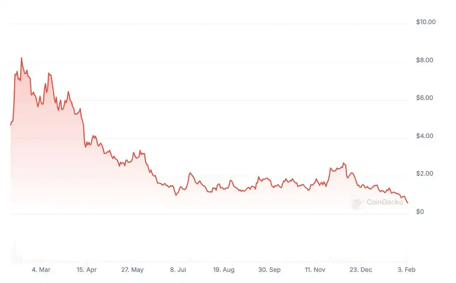 你猜得没错:这些空投从未发生过,代币的价格走势也只是在下跌(下方是 DYM 的图表)。