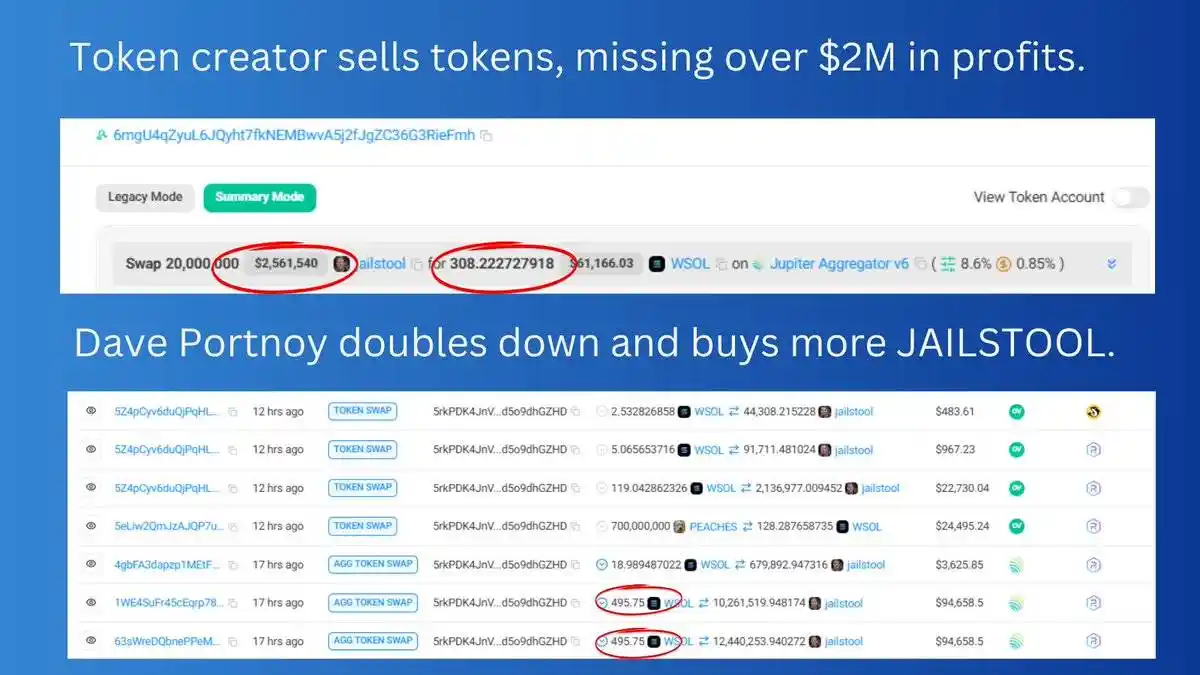 在 Dave 发推几个小时后,#JAILSTOOL 的创建者卖掉了 2000 万枚代币,套现 5 万美元。