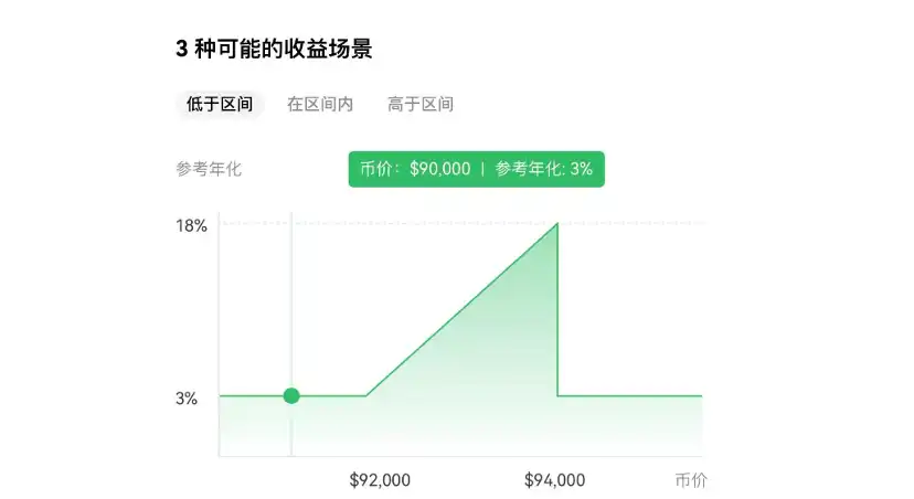 如下图所示,如果到期时标的价格低于 9200 美元或者高于 9400 美元,那么你将赚取 3% 的年化收益,如果标的价格在这两者之间,你将赚取 3%~18% 之间相匹配的年化收益。