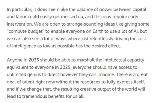 到 2035 年,任何人都应该能够调用相当于 2025 年所有人智力总和的智力能力;每个人都应该能够获得无限的智慧,以他们能够想象的任何方式加以利用。如今,世界上有许多人才没有足够的资源来充分展现自己,如果我们能够改变这一点,世界将创造出巨大的价值,从而为我们所有人带来巨大的好处。