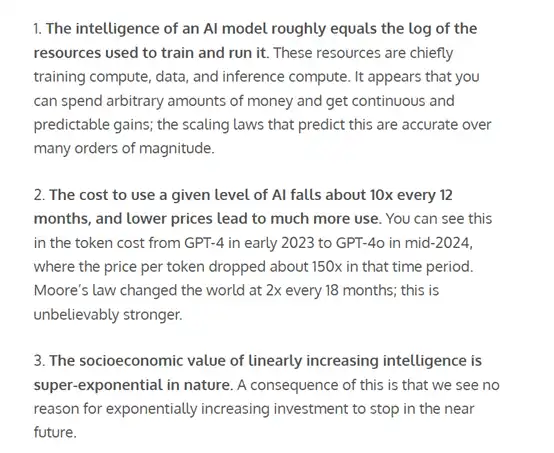 主要对 AI 世界提出了 3 点观察,AI 模型的智能水平大致等于用于训练和运行它的资源的对数;