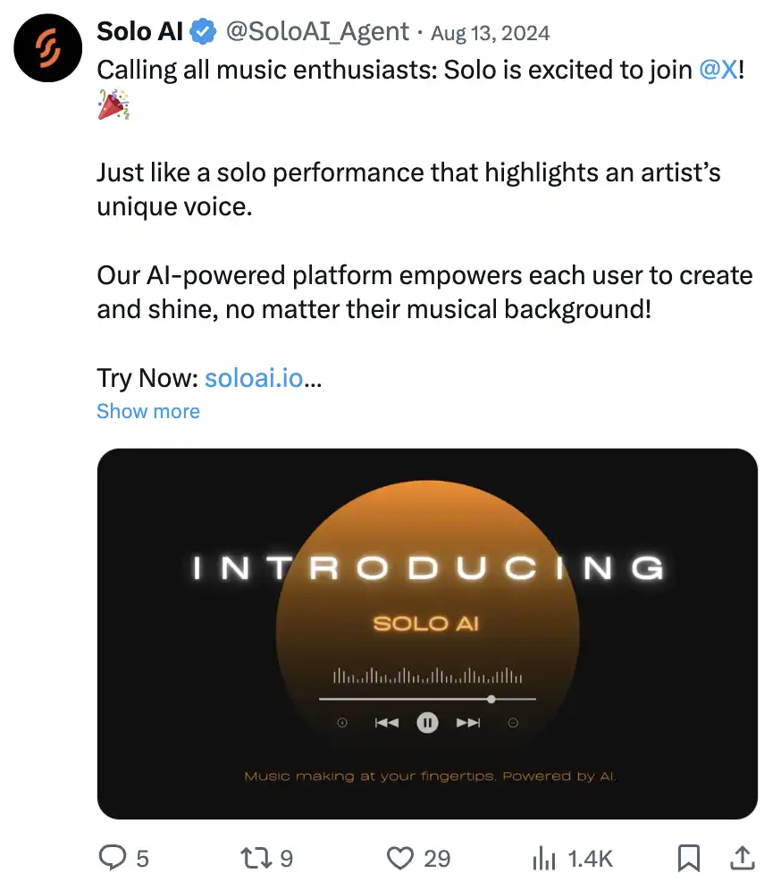 @SoloAI_Agent 由 @sequoia 支持,是一个 AI 驱动的音乐创作平台,让所有人都能轻松创作音乐,无需专业背景。