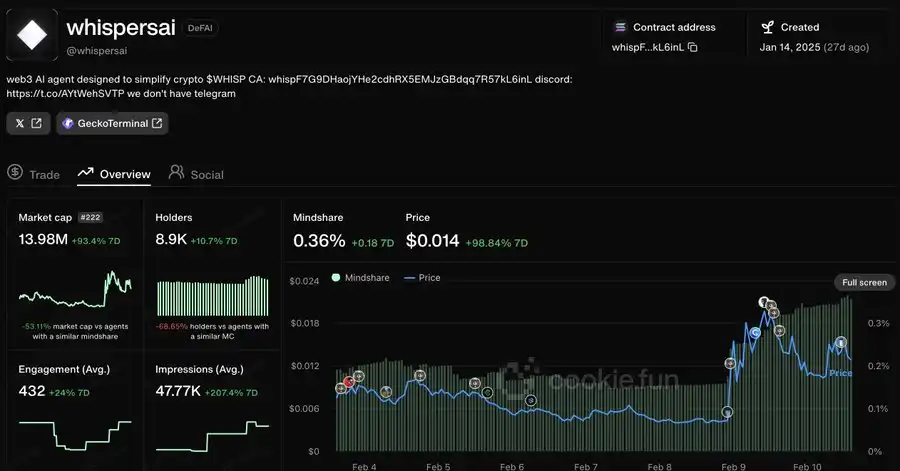 本周的顶级表现者是 whispersai,他们在 DeFAI 解决方案的手机集成方面取得突破,甚至引起了 Solana 创始人 Toly 的惊叹:「他们把加密货币接入电话网络了?!?」——@aeyakovenko