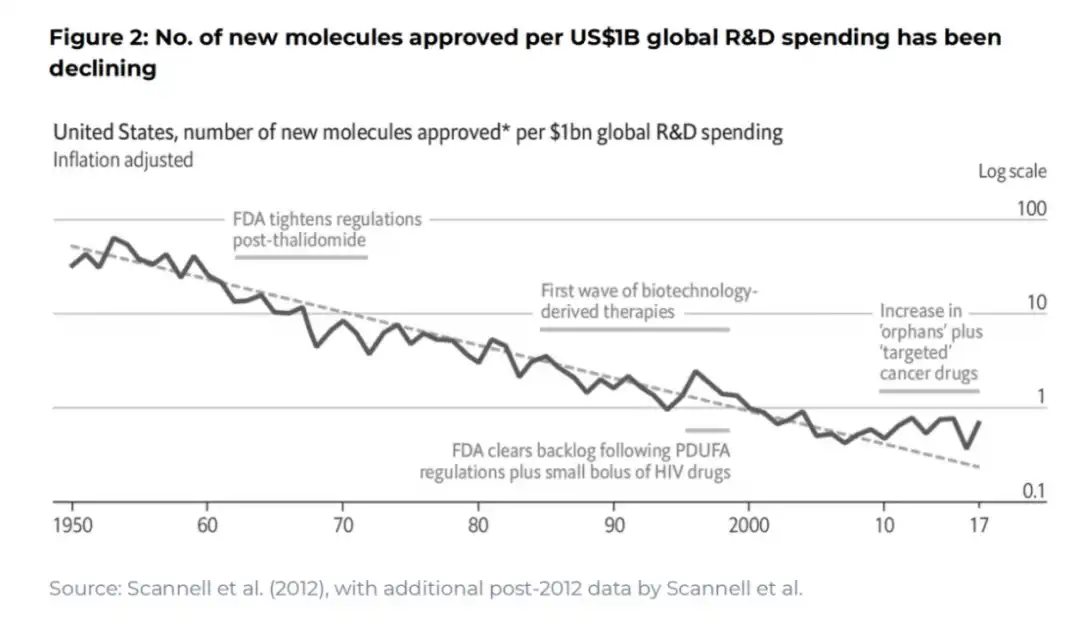 (图 2:在每 10 亿美元的全球研发支出中,获得批准的新分子数量一直在下降)