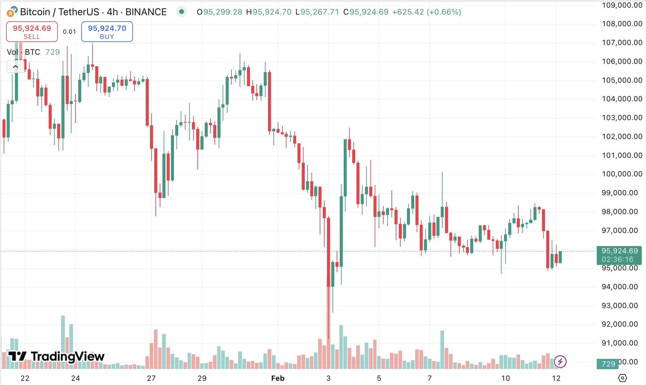 2025年2月3日至2月10日期间,比特币市场经历了显著波动。2月3日,比特币价格从开盘的 101,361 美元下跌至最低点 95,064 美元,跌幅约为 6.2%。随后,价格在2月4日反弹至 102,052.28 美元的高位,但未能持稳,随后回落至 97,963.3 美元。截至2月10日,比特币价格在 96,500 美元至 98,200 美元之间波动。