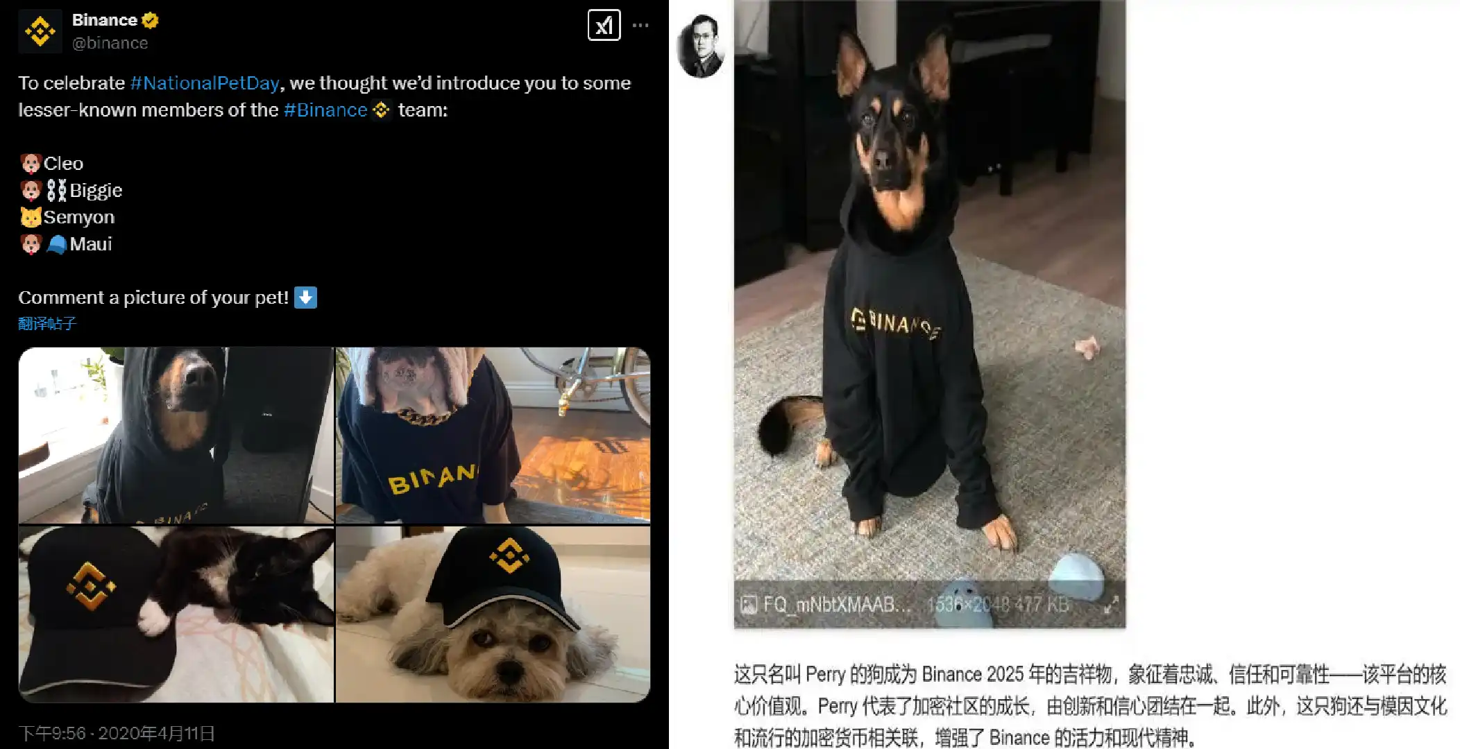 为了扒出狗狗的真实信息,网友们展开了一场「地毯式搜索」。有人找到了 2020 年 Binance 官方层曾发过的三只狗狗和一只猫咪,是 Binance 成员们的宠物,有人猜测其中一只可能是 CZ 的。也有人制作了一张穿着 Binance 衣服的狗狗 Perry,并配文暗示其与 Binance 关系匪浅,很有可能是 CZ 的狗...... 直到现在,仍有层出不穷的号称是「CZ's dog」的 Meme 币在不断发行,部分 Meme 币市值短时突破百万美元。