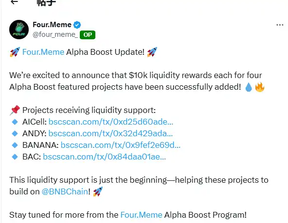 值得一提的是,Four.Meme 官方也对一些优秀的项目给予曝光、流动性支持,因此关注官网的 Alpha Boost 也是筛选优质 Meme 标的的一种方法。