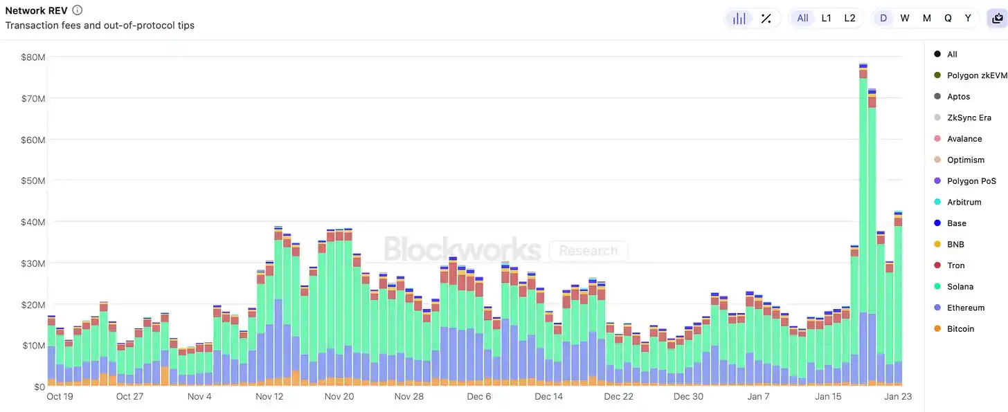 关于 Solana 上 REV 增长的叙述也被用来倡导对以太坊的变革。隐含的论点是,以太坊必须进行扩展,才能重新获得失去的活动(和 REV)。考虑到 Solana 的活动完全由 Memecoin 推动,这一点并不合理。将 L1 的执行扩展 5 倍或 10 倍,并不会把 Memecoin 带回以太坊 L1;Solana 仍然有较低的费用和更强的短期财富效应。