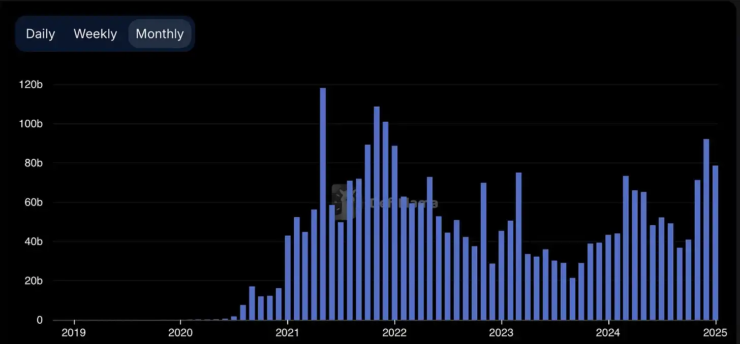 如果 DeFi 整体上迁移到了 Solana,我们本应看到以太坊的交易量出现显著下降。但以太坊在 2023 年 12 月的 DEX 交易量仍保持在历史最高月度交易量的 10%-20% 之间,即便在 2021/22 年的牛市期间,ETH 价格波动更大,NFT 和 Memecoin 的交易量也远远高于现在。