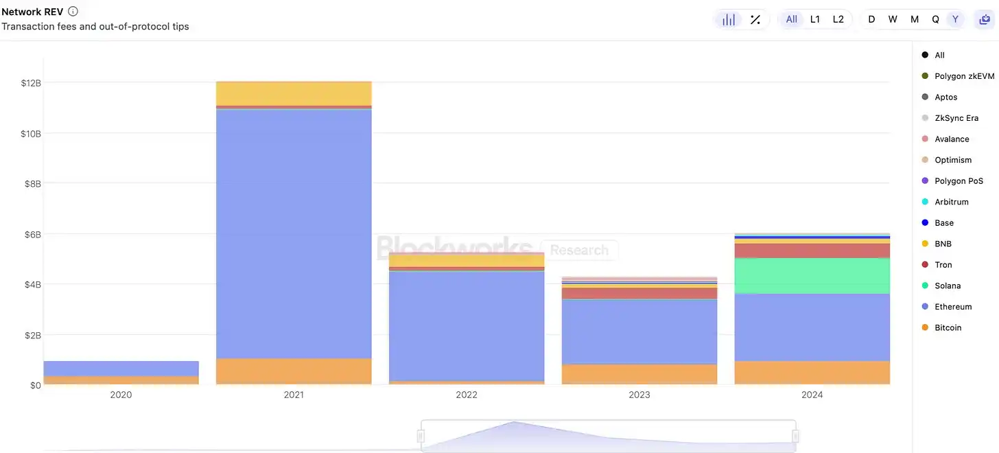 这一切之前都发生过。如果我们回顾 2020-2021 年,我们会看到 Ethereum 上 REV 的惊人增长。在上一个牛市中,ETH 持有者的新财富流向了越来越波动的链上资产,比如 NFT 和 Meme 币。