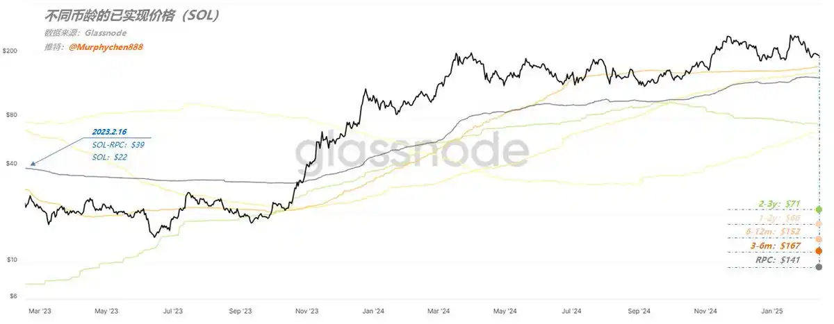 图 2 是 SOL 的不同币龄的 RPC 数据。在近 2 年内 SOL 投资者的持仓体验也非常好。可以看到所有长期持币群体的平均成本都要低于当前 SOL 价格。3-6m 的成本是$167,2-3y 成本是$71;