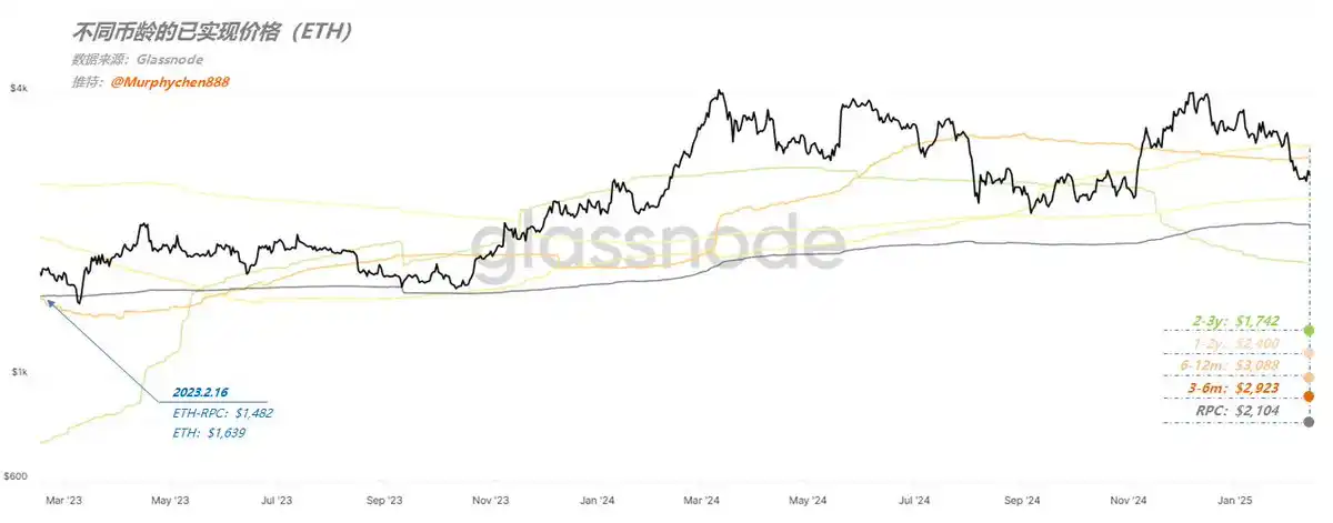 截止到 2 月 13 日,ETH 的 RPC 是$2,104,这也正好是 2 月 3 日暴跌插针的最低点(产生了强支撑)。按当前价格$2,700 算,投资者平均只有 24% 的浮盈。这个比例比 SOL 和 BNB 都低,更是远低于 BTC。