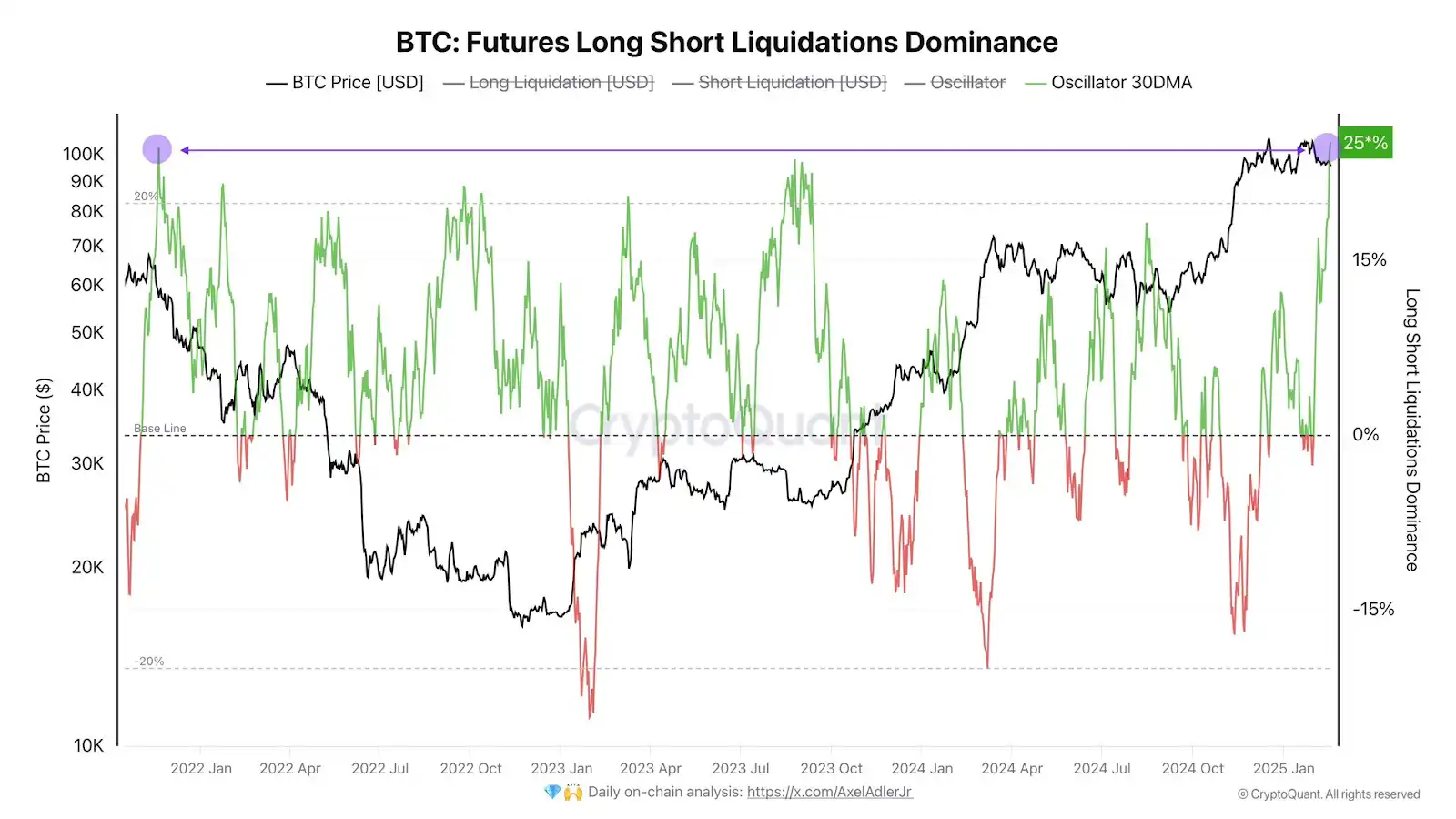 2 月 16 日,IFP 指标首次自 2024 年第三季度以来转为负值,表明市场情绪可能正在发生转变。比特币研究员 Axel Adler Jr 也指出,比特币期货的多头仓位清算已达到两年来的最高水平。这与 2022 年 1 月的情况类似,当时多头仓位清算标志着熊市的开始。