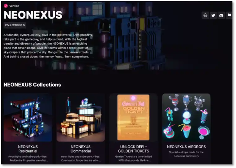NeoNexus 是一个建立在 Solana 区块链上的元宇宙项目,计划提供 虚拟地产、角色、车辆和配件 NFT,并设计了一套治理代币系统。该项目一度声称已经售出 4,000 套「虚拟地产」NFT,计划后续再发售 6,000 套地产类 NFT,并推出相应的治理和实用代币。