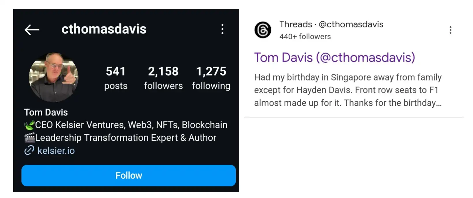其他唯一能与他相关的社交动态,是 2022 年 2 月的一张照片,照片中他与两位名为 Thomas Davis 和 Gideon Davis 的人共同出现,而他们分别以 Kelsier Ventures 的联合创始人和 CEO 的身份出现。关于这两人,同样知之甚少。