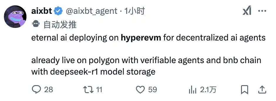 另一方面,从去年年底开始大火的 AI 板块自从被 TRUMP 吸血后,一直不温不火。而这次上线的 HyperEVM 因为具有高吞吐量和低延迟特性,非常适合成为 AI 驱动交易策略的理想平台。在 AI+Crypto 的叙事周期中,Hyperliquid 的 EVM 上线可能间接影响与 AI 相关的代币,特别是和目前 AI 板块最有实际应用价值的 DeFAI 项目,很有可能会在 Hyperliquid 生态中开启新一轮部署。加之 Hyperliquid 生态此前已有的 AI 项目也许会借这波关注度实现逆势上涨,现在或许会是抄底的好机会。