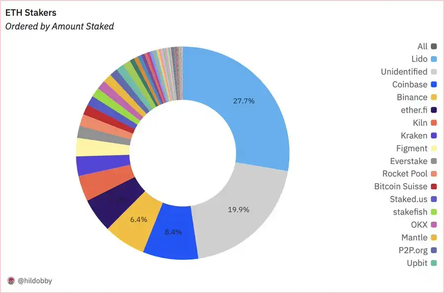 我的质押仪表板显示 Coinbase 占 8.4%,因为只有标记的地址被标注,其余的都是「未识别」。