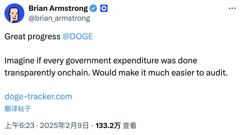 Brian Armstrong 还曾发文表示:「想象一下,如果每一项政府支出都是在链上透明进行的。审计将变得容易得多。」