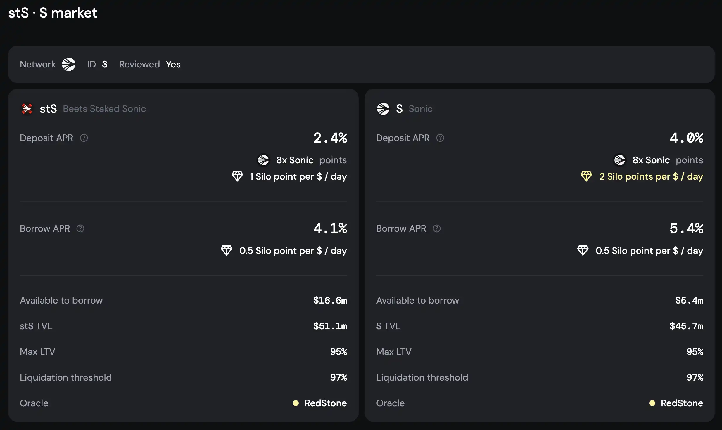在 Silo Finance 上借入 stS 代币,获取 8 倍的积分加成。随后将 stS 代币出借,获得 4.1% 的出借收益。而每日能获得 0.5 个 Silo 积分的加成。该策略的基础收益为 4.1% 和每日 0.5 个 Silo 积分的奖励,虽然收益不高但优相对的风险也更小。