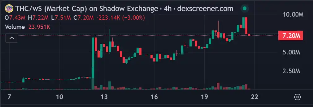 猫猫狗狗作为大众喜闻乐见的小动物,一直是 Meme 币最经典的形象选择。Sonic 链上第二大 Meme 币 Tinhatcat 就是一只带着粉色帽子的猫咪,可爱的画风和多元的二创也引领了代币 THC 的起飞。THC 代币的市值在 12 日单日迅速拉涨,从 1.63M 美元上涨至 6.91M,单日上涨幅度高达 322.61%。此后 THC 代币一直波动上升,截至撰稿,市值为 7.2M 美元。