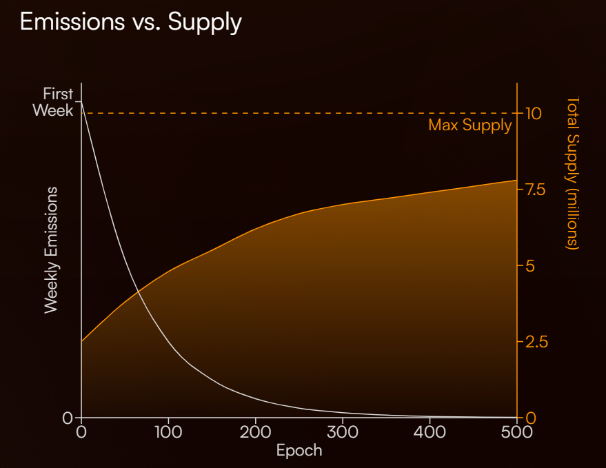 SHADOW 代币初始供应量为 300 万枚代币,10 年后(500 个时期)发放约 500 万个代币,最大供应量上限为 1000 万枚代币。