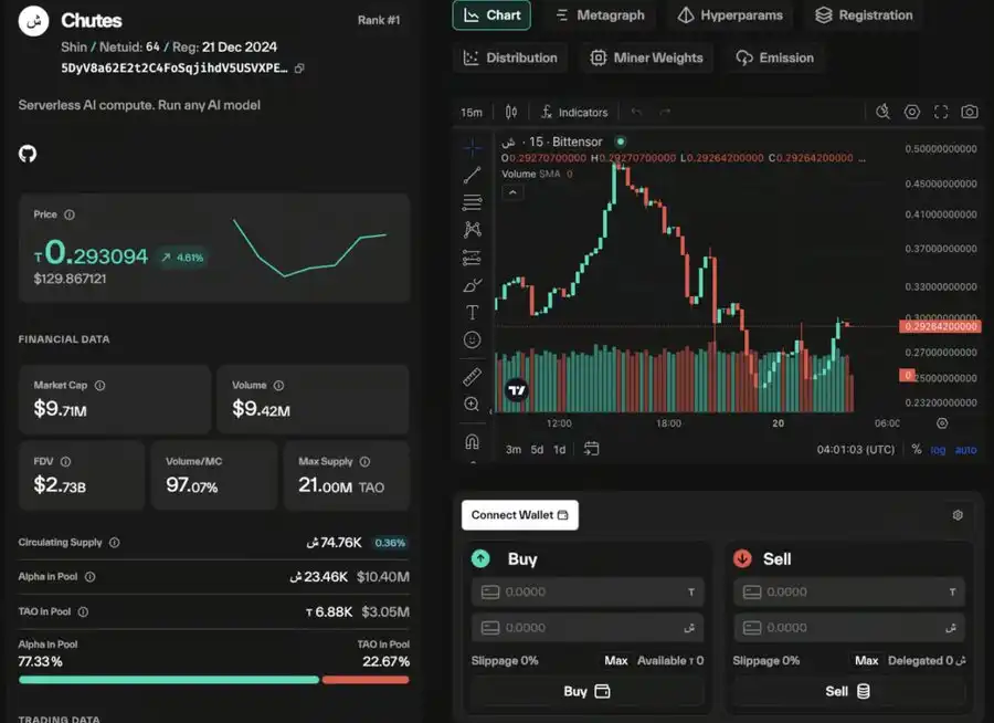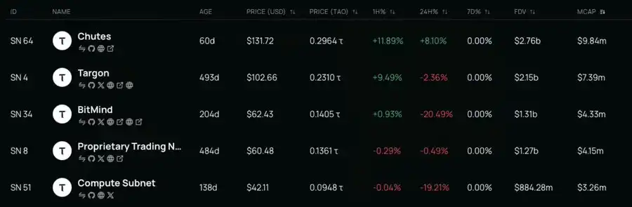 截至目前,每个子网的 Alpha 流通量不到 0.4%,所以你会经常看到市场价值较低,但完全稀释后的估值却非常高,通常达到数十亿美元。