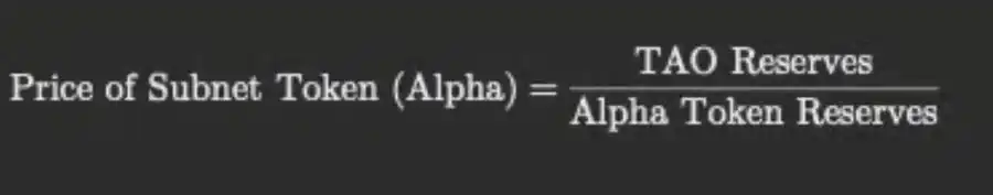 每个子网运营一个 AMM 池,其中 TAO 与 Alpha 代币成对。Alpha 的价格是根据池中 TAO 与 Alpha 代币的比例动态确定的。