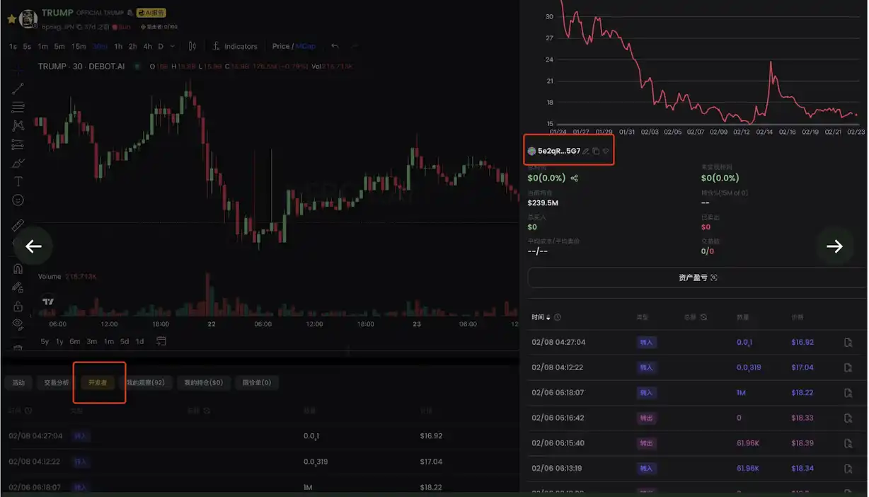 首先,我们打开 debot(https://debot.ai)输入$trump 的 CA 后,找出 dev 的地址 5e2qRc1DNEXmyxP8qwPwJhRWjef7usLyi7v5xjqLr5G7,如图