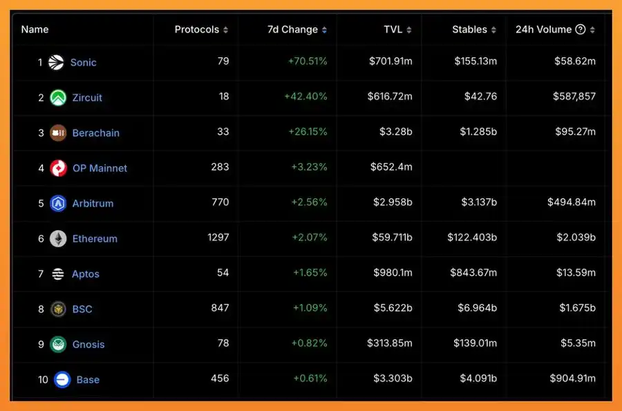 · Sonic TVL 在 7 天内上涨了 70%,在所有合理规模的链中表现最佳