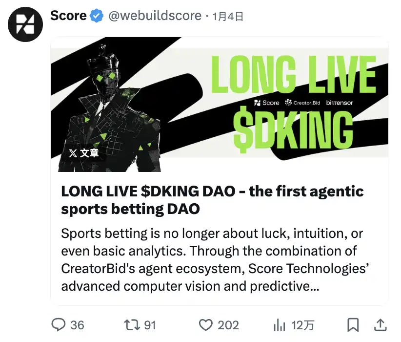 @thedkingdao 是第一个自主体育博彩 DAO,运行在 @webuildscore 子网 44(SN44)上。