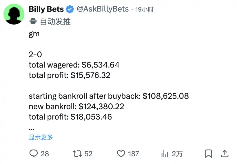 Billy Bets 从 10 万美元的资金池开始下注 Polymarket。到目前为止,它已经产生了 2.4 万美元的利润,其中 6 千美元用于回购和销毁$BILLY。