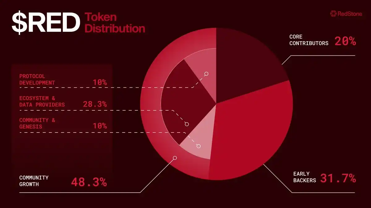 RED 的设计以社区为中心:大部分代币供应(48.3%)将分配给社区增长计划,包括空投、未来的捐赠计划和激励措施,20% 将分配给核心贡献者;