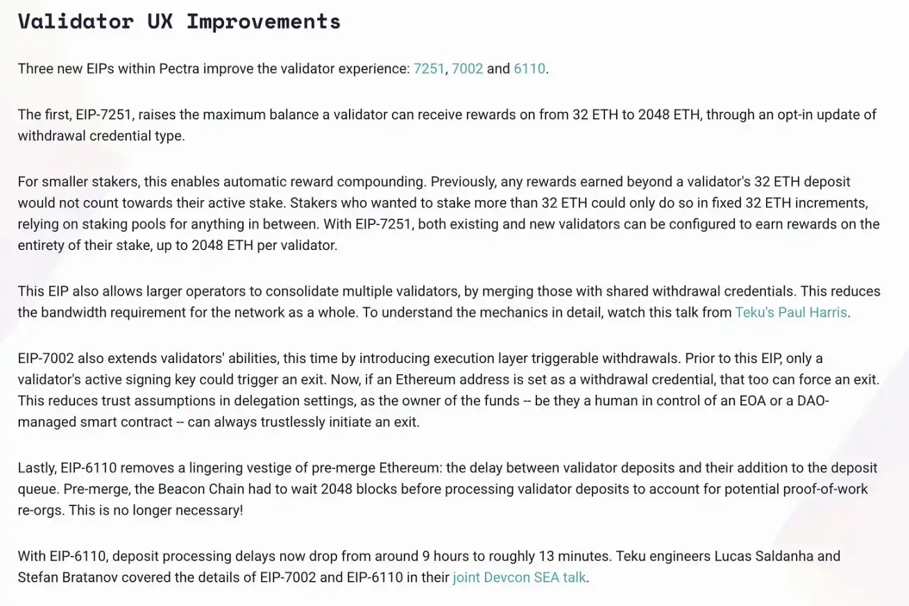 EIP-7251 :将验证者的最大余额提升至 2048 枚 ETH,并允许自动对更大额的有效质押奖励进行复利计算。此前,奖励仅基于 32 枚 ETH 的余额来计算。此外,现在较大规模的验证者可以将多个 32 枚 ETH 的验证者合并为一个。