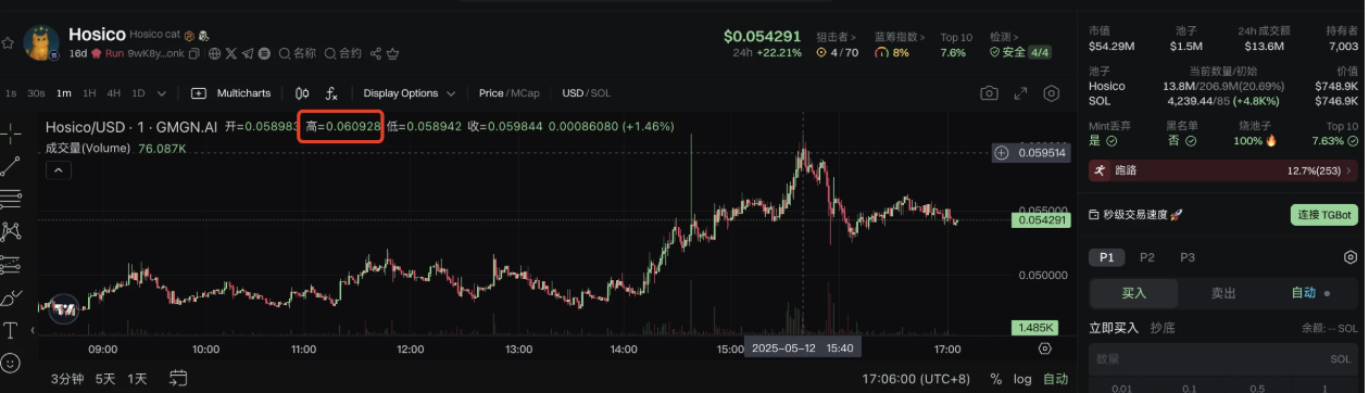 原型为 Instagram 上拥有 180 万粉丝的可爱猫咪,在 Letsbonk.fun 平台上发行的 Hosico 是吉卜力 AI 画风类型的 Meme 币。据 GMGN 平台信息,Hosico 代币信息如下: