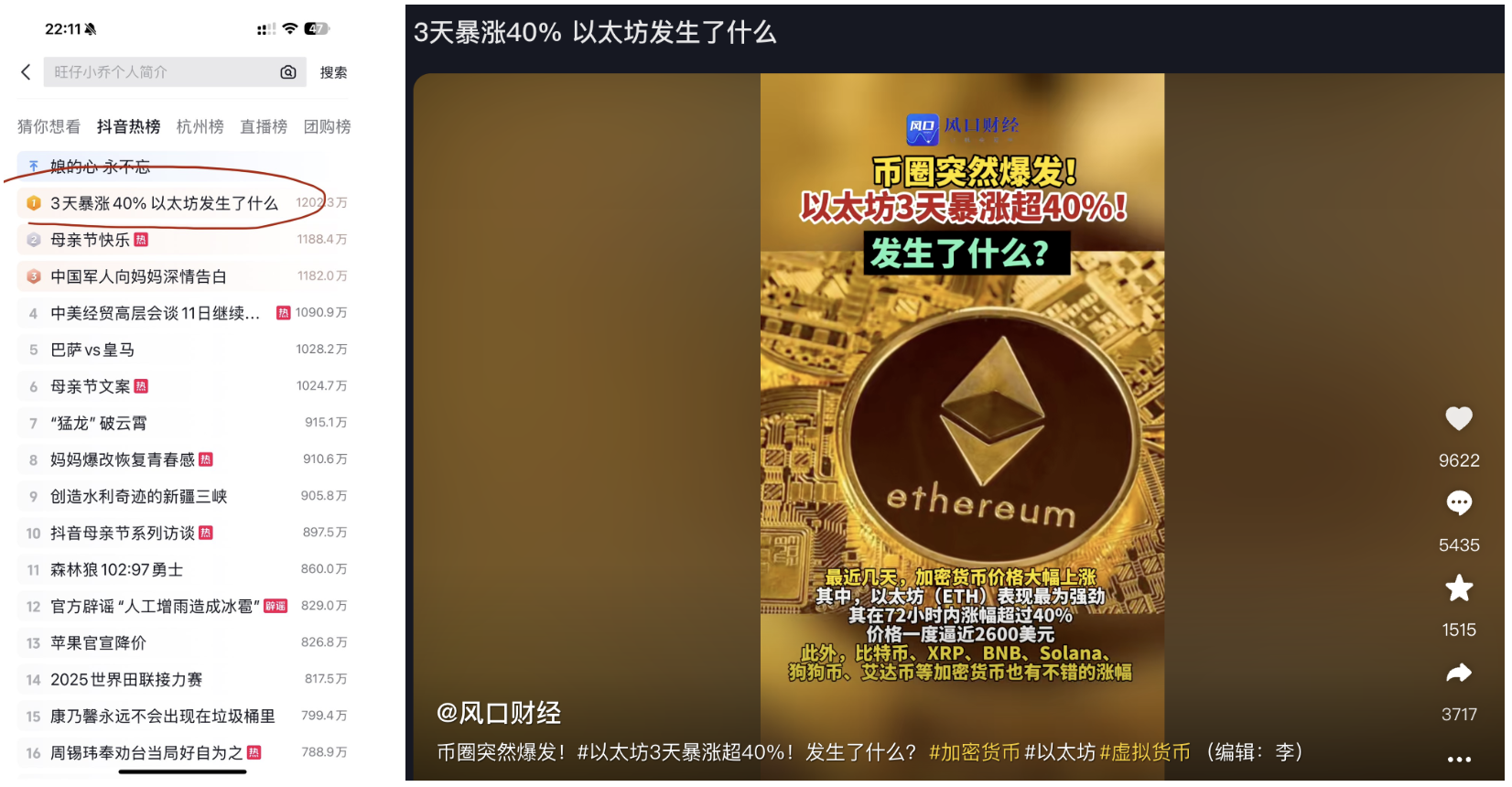 无论你是身在圈内还是置身圈外,这两天一定对以太坊的消息不太陌生。原因很简单,让 E 卫兵们一度扼腕叹息,让捍卫者几近被洗下车的以太坊,凭「3 天暴涨 40%」,登上抖音热榜第一了。