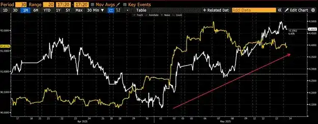 彭博亚洲美元指数(金色)与美国 10 年期国债收益率(白色)。当美元指数上升时,亚洲本地货币走强,我们看到 10 年期收益率相应上升。