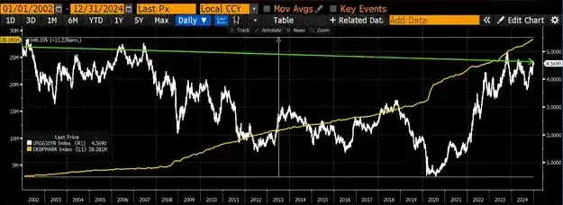 接下来的三个图表,我使用的是 2002 年至 2025 年初的数据,因为中国在 2002 年加入了世界贸易组织,而 2025 年 1 月初是美国市场上「特朗普要修复世界」的乐观情绪高涨的时期。