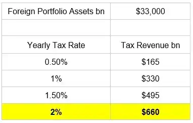 目前,外国投资组合资产的总价值约为 33 万亿美元。假设价格恒定且没有资本因税收而外流,我们来看看每年的税收收益情况。