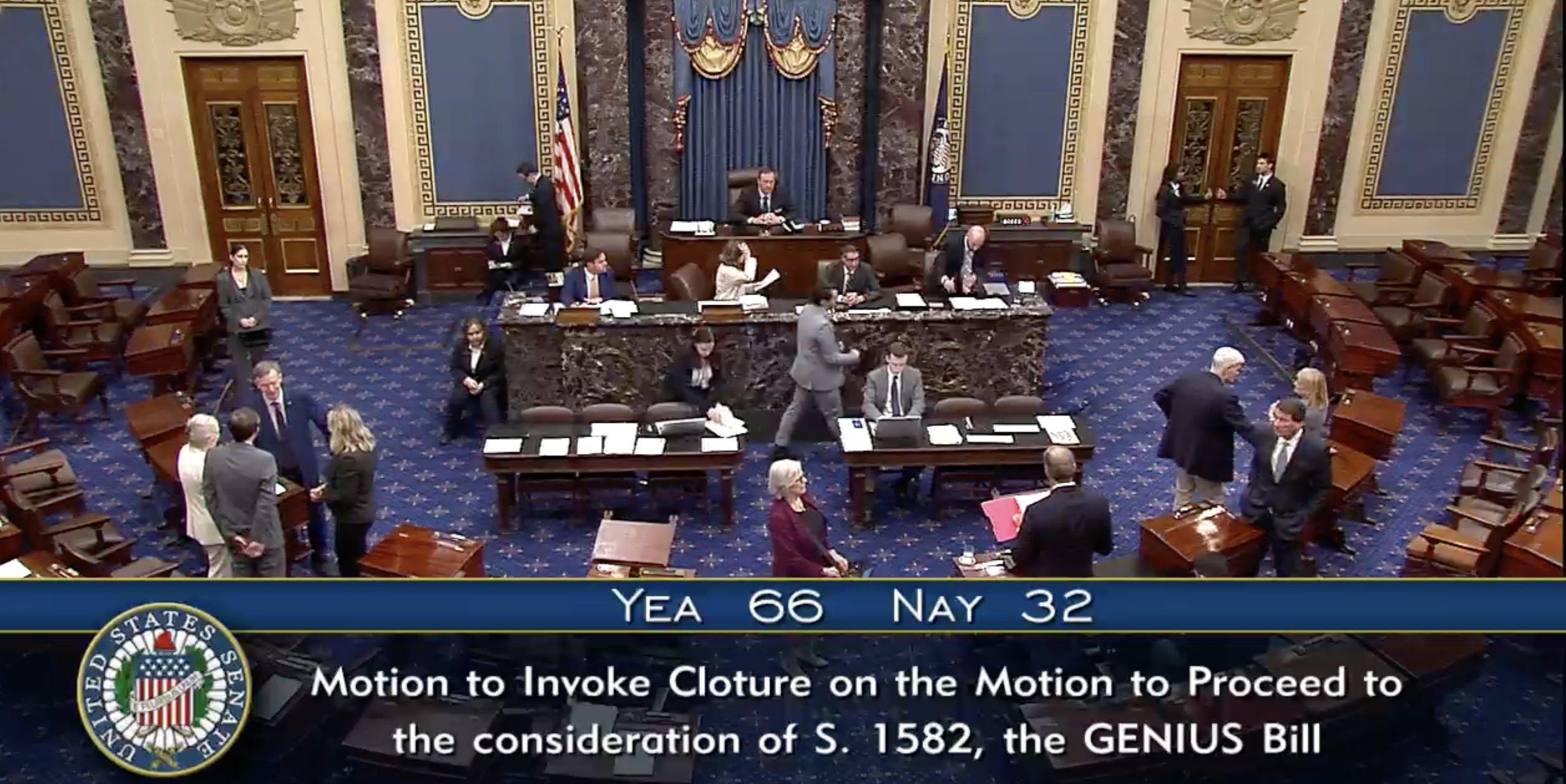 5 月 8 日,GENIUS Act 在参议院的终止辩论投票 (cloture vote) 中以 48:49 票意外失败,未能获得 60 票。但在 5 月 20 日上午,美国参议院再次投票,以 66 票支持、32 票反对的表决结果,通过 GENIUS Act 稳定币法案的终止辩论动议 (cloture)。