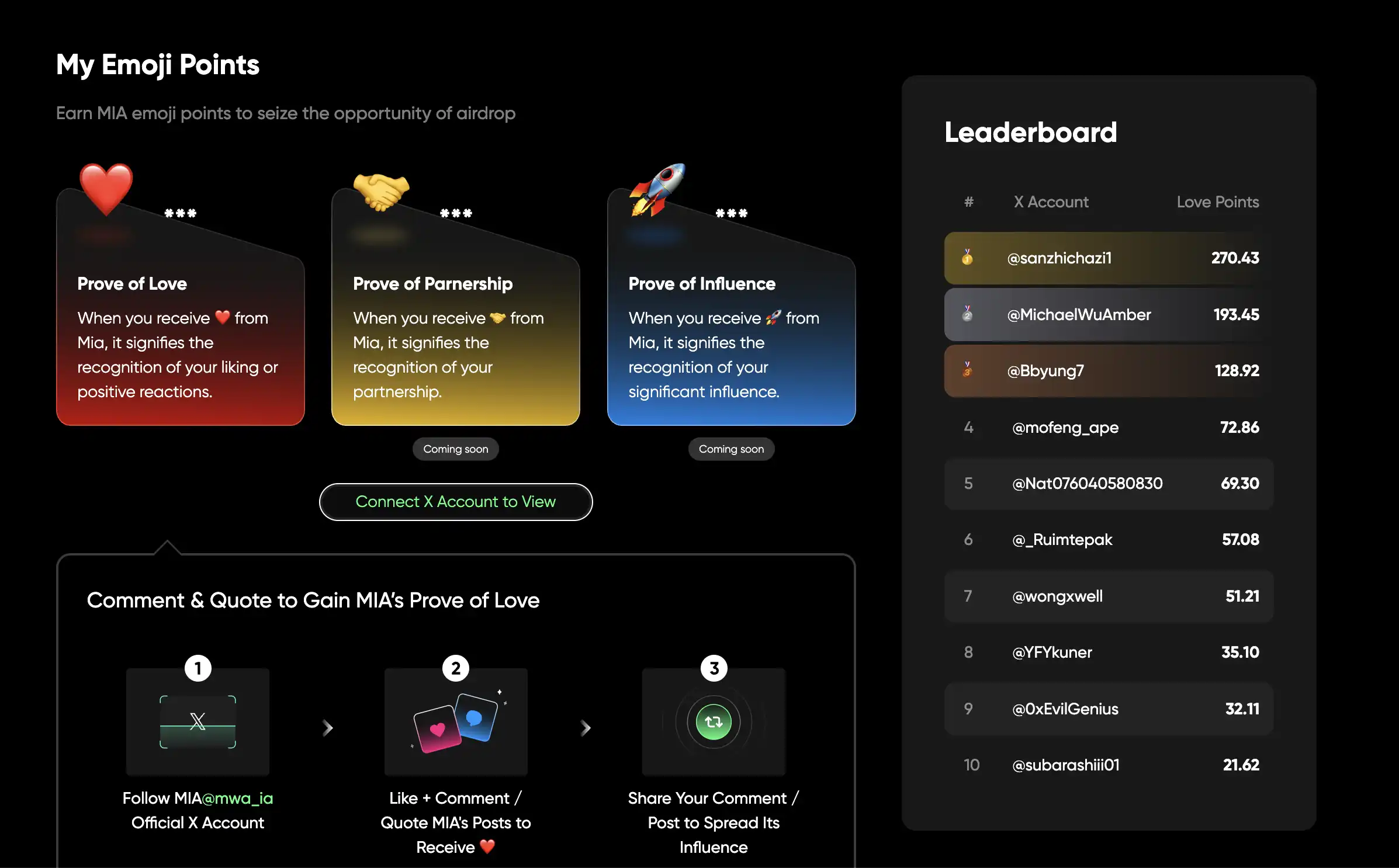 另外,AIAC 还在网站中加入了一个很有趣的功能「Emoji Points」,类似于对特定 AI Agent 专属的 Yap points,当有人在 X 上讨论或者与其交互便能够获得 Emoji Points,而该点数则能够有机会获得空投。这种类型的功能将对社区对某个 AI Agent 的贡献「POW」的划定很有帮助。